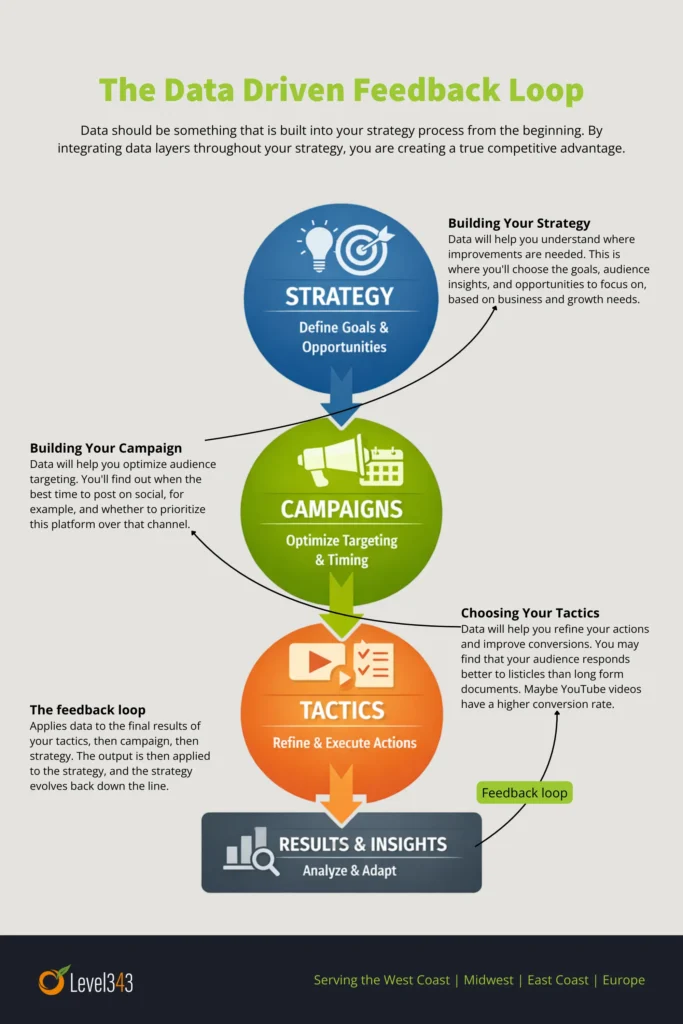 Data should be something that is built into your strategy process from the beginning. According to Invoca, 87% of marketers say data is their company’s most under-utilized asset. By integrating data layers throughout your strategy, you are creating a true competitive advantage. The infographic below shows how the feedback loop should work.